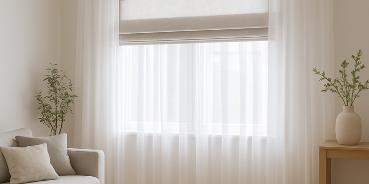 У нас такой вариант сработал отлично. Лучше выбирать тюль нейтрального цвета, белый, кремовый или бежевый, он даст лёгкость и не будет конкурировать с римскими шторами. Римская штора пусть будет в тоне стен или немного контрастнее, но без ярких принтов, тогда композиция будет смотреться гармонично. Размещать тюль стоит ближе к стеклу, а римскую немного впереди, чтобы тюль стал мягким фоном и не мешал движению шторы.